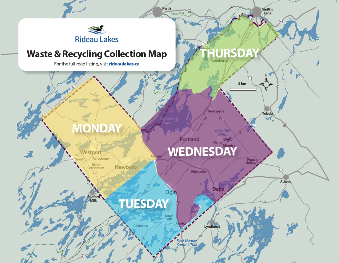 Each household is entitled to place 3 bags of household waste out each week. Household waste must be in a clear bag (no colour) with a current Rideau Lakes’ bag tag attached, weighing less than 40 lbs. All bags set out for collection must be tied and your bag tag must be clearly visible to the driver. During hot weather, freeze decaying material as bags will not be picked up if worms are present. Waste bags containing mostly recycling material will not be collected, as we encourage everyone to recycle. Dark bags will not be picked up. Bags may be placed inside a waste container, however tags must be at the top, clearly visible to the driver.